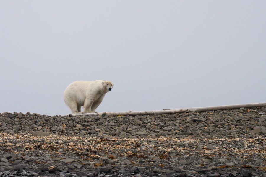 On the third day of the expedition, we found bears on a small rocky island just off the mainland of one of the larger islands. There were two, maybe three polar bears roaming around on this island. We milled around offshore in the zodiacs looking for good places to shoot photos of them. Eventually a large animal carcass, possibly a walrus was seen on the shore and would seem to be what attracted the bears. Polar bears are said to have incredibly good sense of smell and probably detected the carcass from a great distance and then swam to the island to investigate. The bear in the photo above was wandering the island not far from the carcass and stopped to sniff the wind occasionally.