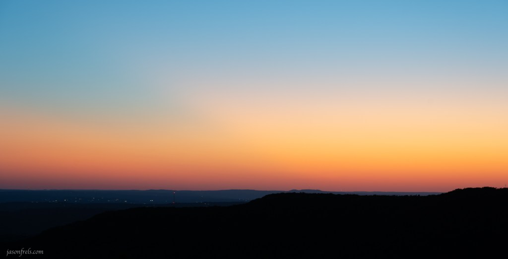 I don’t hike in this section of the refuge very often because frankly it isn’t all that scenic out there. The trails are on a hillside that overlooks some bends in the Colorado river/Lake Travis (whatever you want to call it) and that sounds like it would be very scenic. But the housing developers have mechanically removed most of the beauty from the landscape and it isn’t fun to look at. But hike I did and then I made it back up to the sunset deck just as the sun was setting. There was a good size group of people already there who seemed to have the same idea as me.