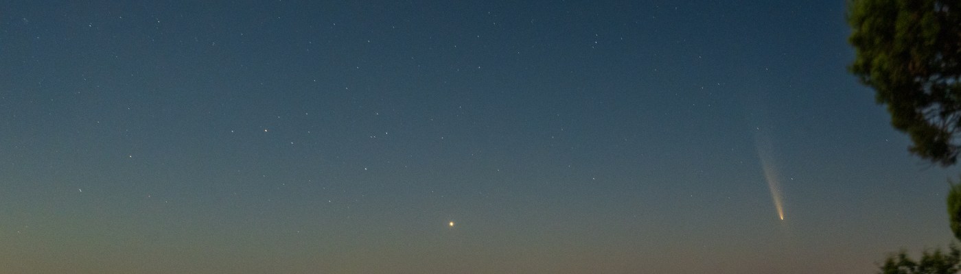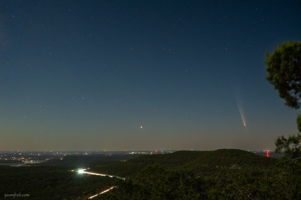 Eventually it got dark enough for a good view of the comet. I decided a much wider frame would work better and be less prone to camera shake. I was also able to time some traffic on the highway down the hill and get some light trails. The image below shows the view from the sunset deck with the night sky featuring Venus and a comet. The comet gives you a very clear indication of about where the sun had set. If you look carefully and use some imagination, you can see a hint of the Milky Way in the far left of the photo. I did not apply any noise correction to the image because I didn’t want it to ruin the stars.