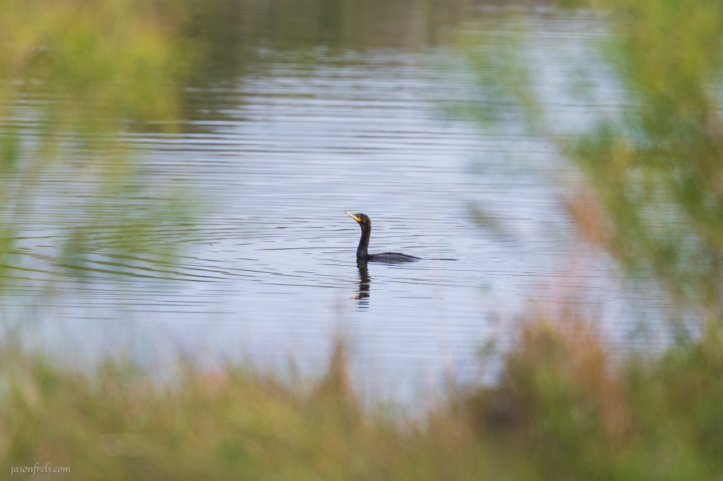 A cormorant, a Neotropic Cormorant I think, was swimming in a pond not far from an alligator. It may be a Double-crested Cormorant which are common as well, I am just not absolutely certain. Neotropic Cormorants live from Texas down to the southern end of South America. They have a rather distinctive hooked beak and I have often seen them drying their wings in the sun. He didn’t stick around long enough for me to question him and flew away soon after he saw me.