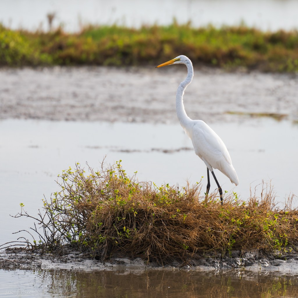 The Great Egret, not to be confused with the Snowy Egret, is very common in the wildlife refuge. In fact they can be found all over the Americas. I saw dozens of them at the wildlife refuge and often see them near where I live. They are a cousin of the heron and their bright white plumage makes them easy to spot. It can also make them a bit difficult to photograph as they over-expose easily. I photographed the great egret show below while walking on the Heron Flats trail. It didn’t seem to be very worried about me standing there pointing a camera at it.