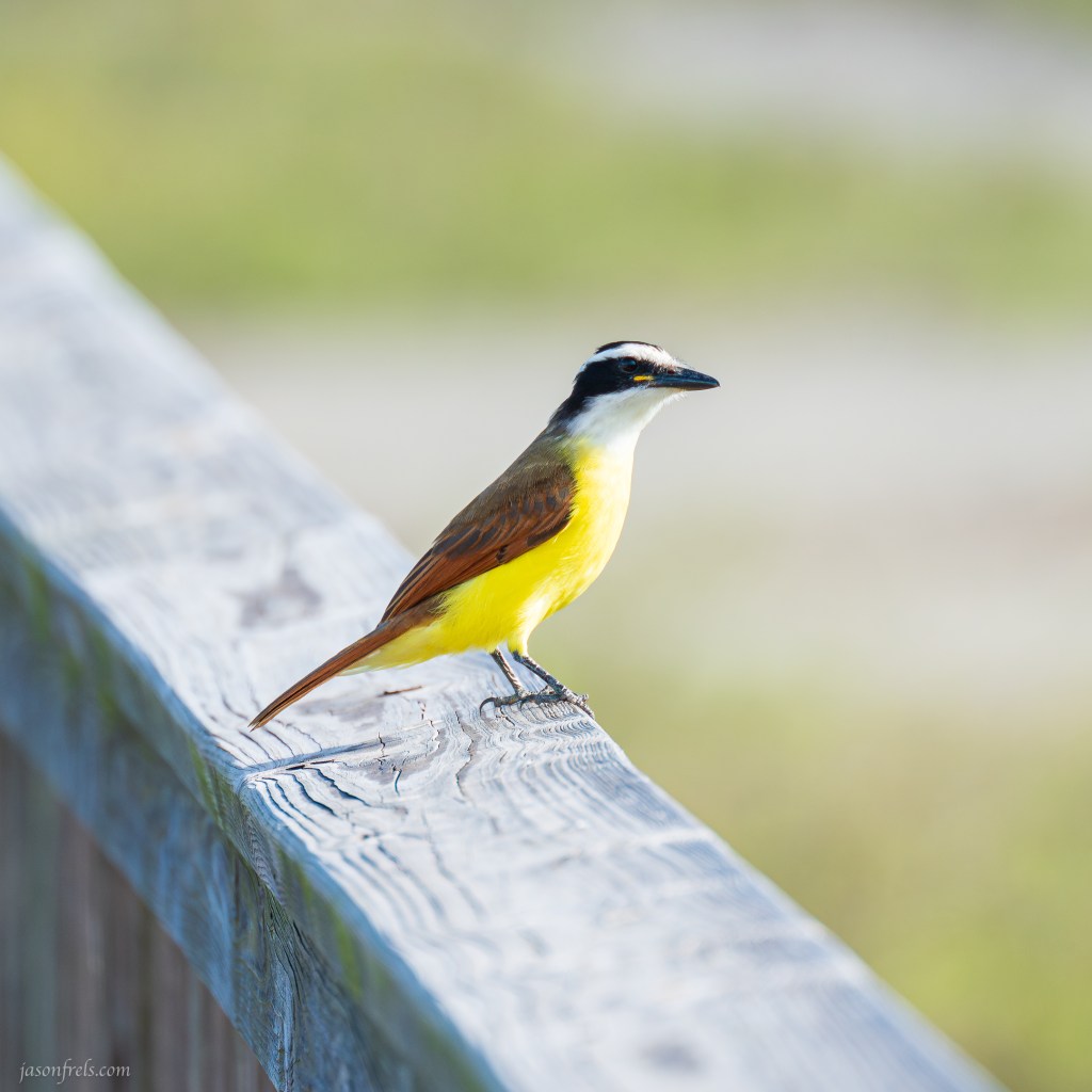 I saw a flock of Great Kiskadees hanging about in a tree near the main observation tower. It is a pretty, colorful bird that mainly lives in Central and South America. The gulf coast of Texas is at the extreme northern end of its range. I guess I was lucky to see them. They are bug eaters, which makes me happy as I was under constant attack by mosquitoes during my time in the wildlife refuge. The birds seemed content to hang out on the boardwalk rail while I photographed them.
