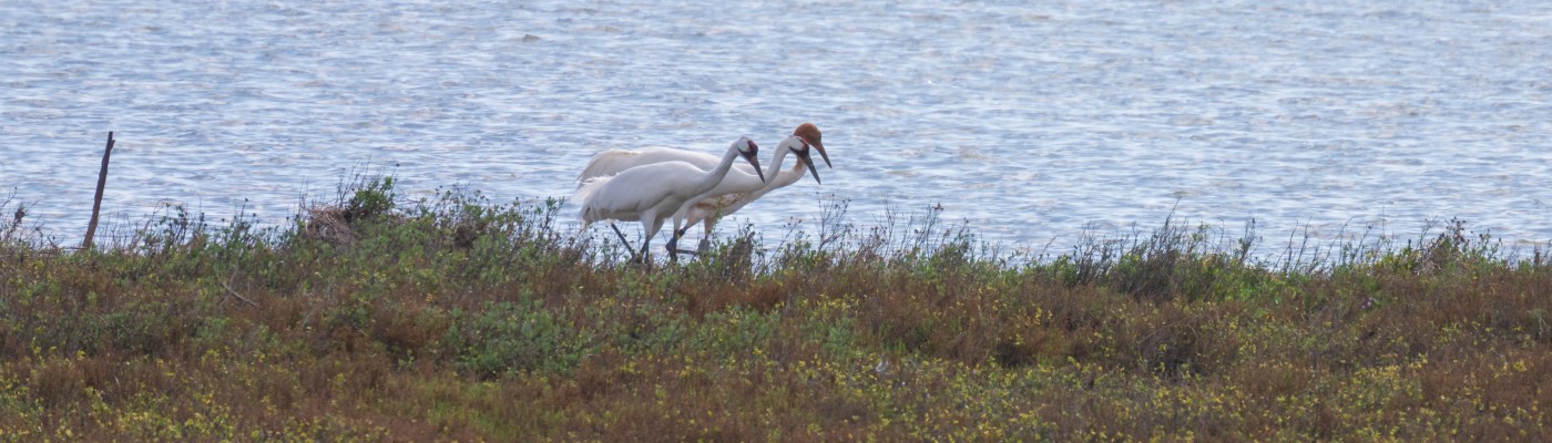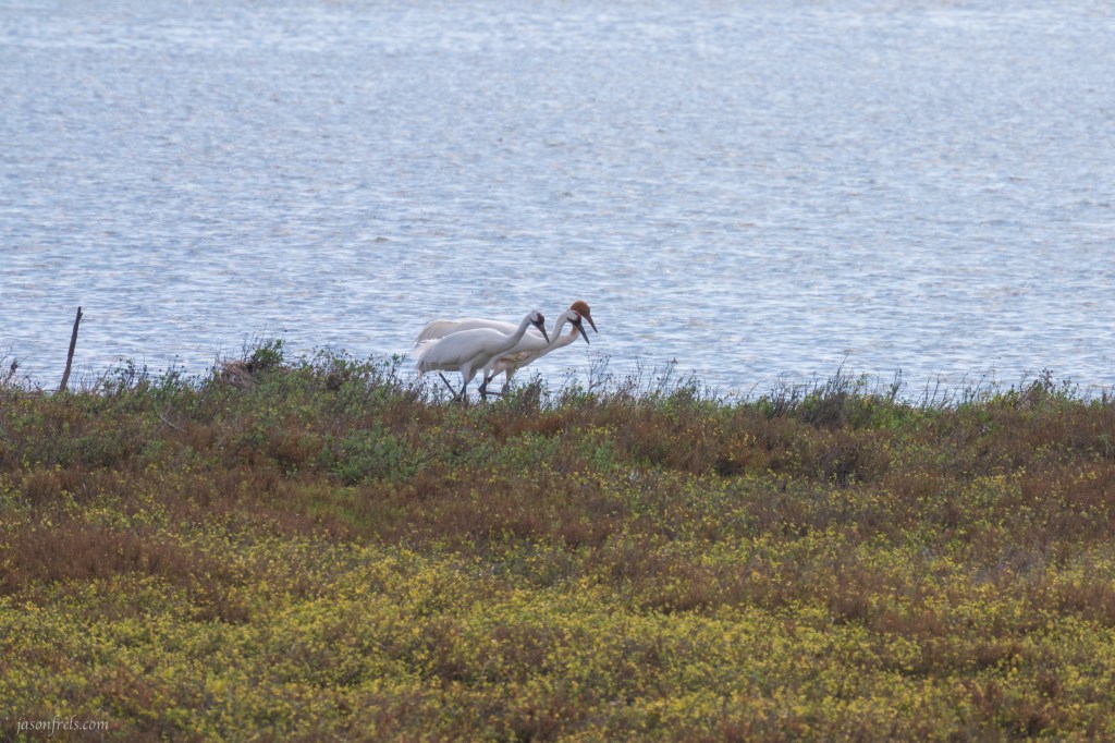 I did see some Whooping Cranes, but only from a distance. They don’t typically get very close to people, perhaps because we have just about driven them extinct. By the 1940s it was believed that there were only 20 or so Whooping Cranes in existence. Today, thanks in large part to the Aransas National Wildlife Refuge in the US that protects their wintering grounds and the Wood Buffalo National Park in Canada which protects their summer breeding ground, there are about 600 Whooping Cranes living today, though many are in captivity. The only natural wild population winters around the Aransas National Wildlife Refuge and I happened to see three of them from the observation tower. The photo below shows a couple of parents and their young-one walking along the shore looking for crabs I suppose. I had to shoot this from a great distance with a teleconverter so it isn’t the sharpest image you’ll see of these birds, but I was very excited to see them. They also hang out just outside of the refuge near Goose Island State Park. More on that next time.