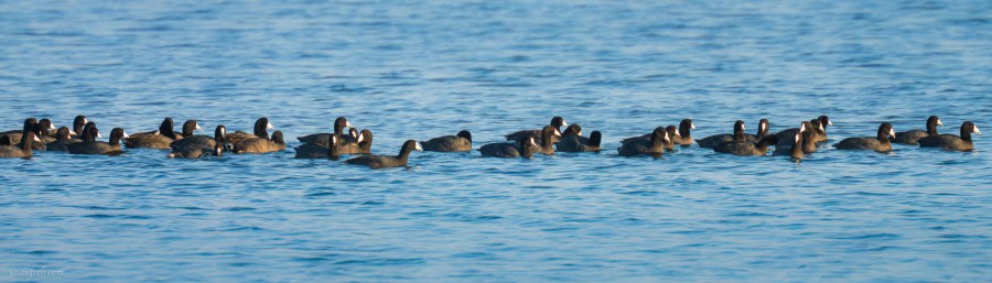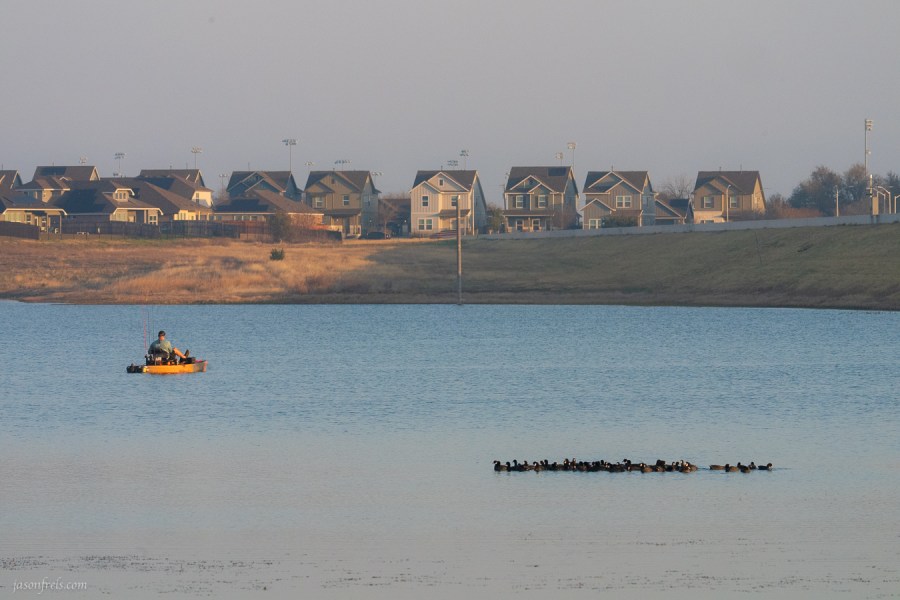 It was a warm summer morning in February and I went to the city park at sunrise with my camera – this is usually a good time and place to find birds as they love the pond. I guess the only people goofy enough to go the pond at sunrise on a Saturday morning are hopeful wildlife photographers and hopeful fishermen. I’m not sure what kind of luck the fisherman in the kayak was having, but I found a lot of great white egrets as well as the flock of American Coots seen with the fisherman below.