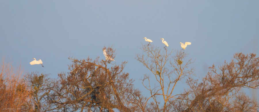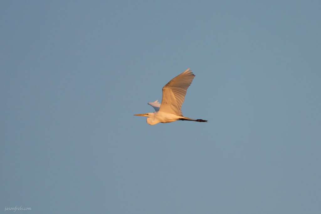 As soon as I arrived, a flock of great white egrets came swooping in over the pond. Fortunately I was ready to go with the bird focus tracking and high frame-rate. Below you can see a couple of shots of the egrets flying with the morning sun just above the horizon behind me. The brightness of the sky changed a bit as I panned tracking the egret over the pond.