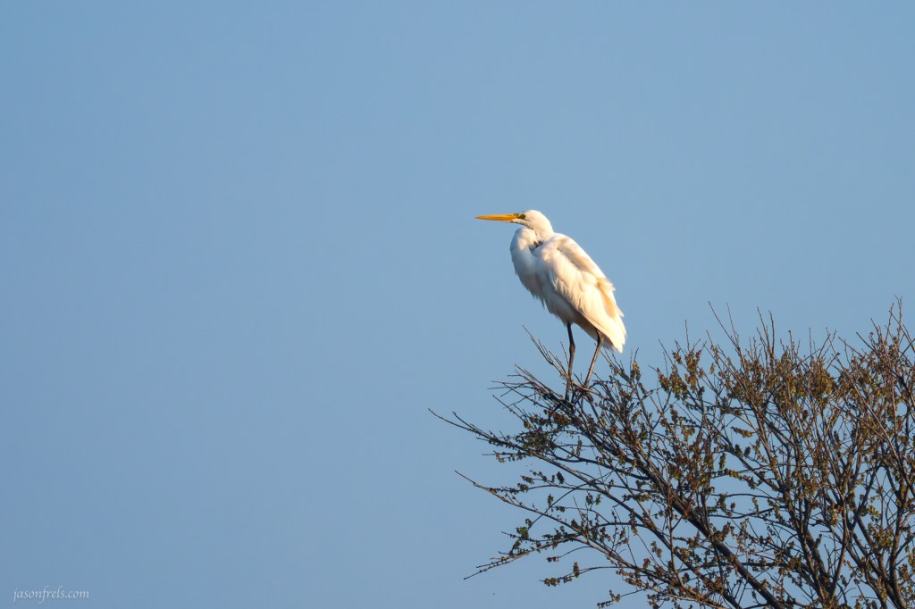 On the opposite side of the park, next to a tree filled with very loud red-winged black birds, I found one of the egrets in the top of another tree and it let me get close enough to get a few photos before I spooked it and it bolted. All of these photos were shot at high ISO to get the shutter speed I needed so I used the noise correction in Lightroom to remove the graininess and sharpen them up a bit.