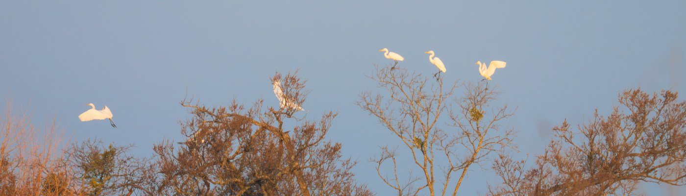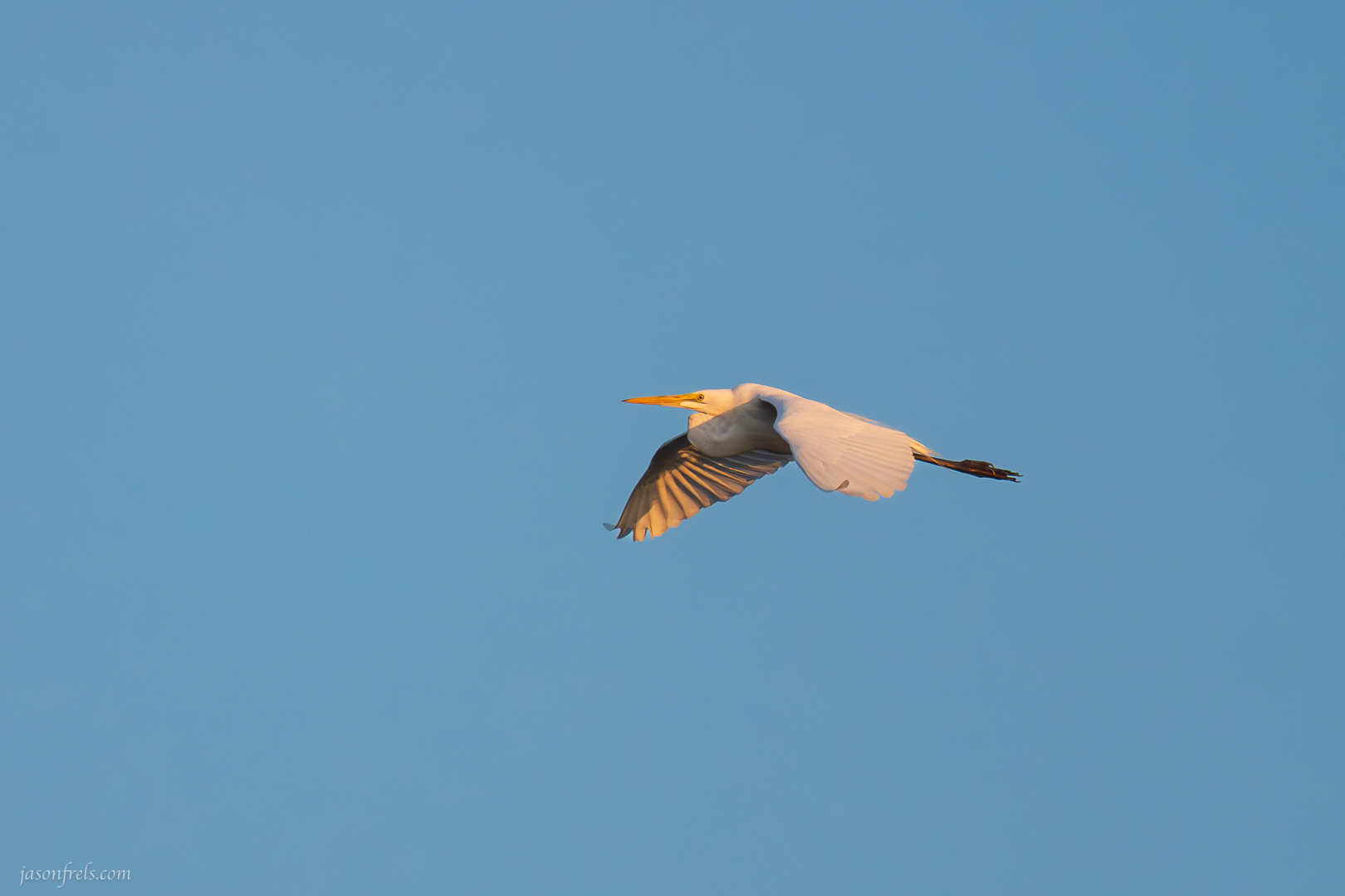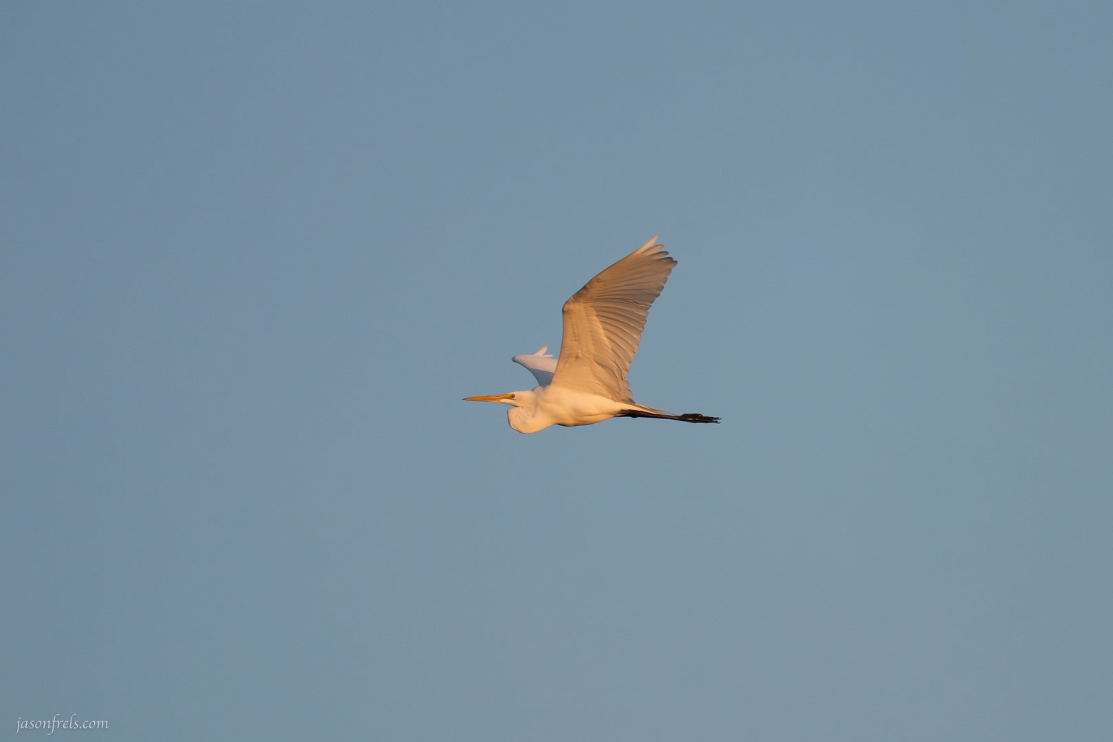 As soon as I arrived, a flock of great white egrets came swooping in over the pond. Fortunately I was ready to go with the bird focus tracking and high frame-rate. Below you can see a couple of shots of the egrets flying with the morning sun just above the horizon behind me. The brightness of the sky changed a bit as I panned tracking the egret over the pond.