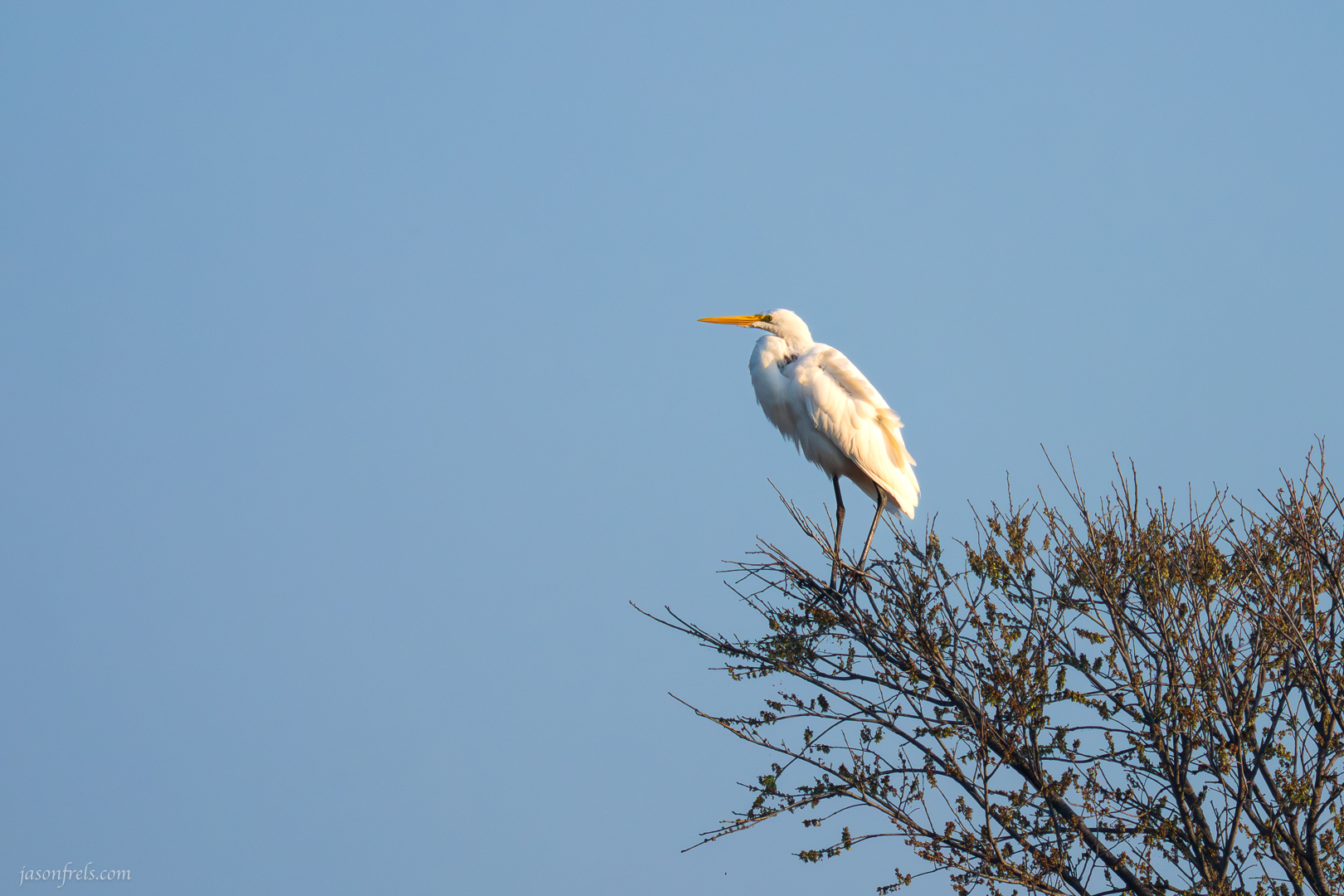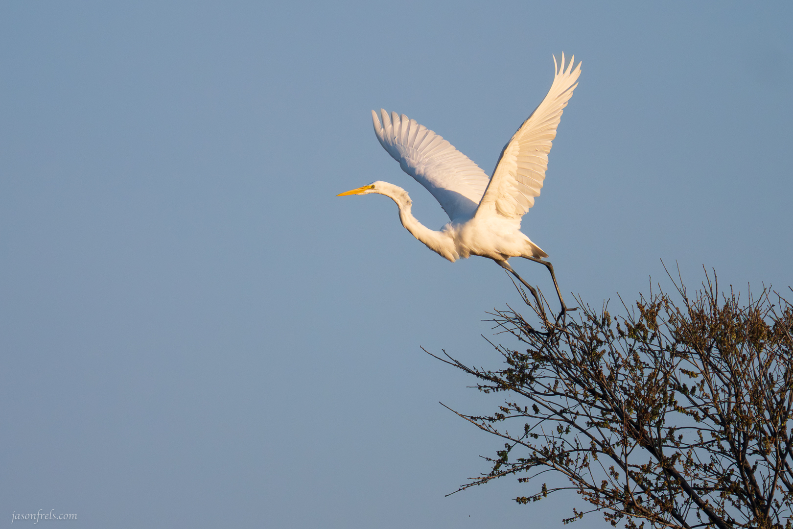 On the opposite side of the park, next to a tree filled with very loud red-winged black birds, I found one of the egrets in the top of another tree and it let me get close enough to get a few photos before I spooked it and it bolted. All of these photos were shot at high ISO to get the shutter speed I needed so I used the noise correction in Lightroom to remove the graininess and sharpen them up a bit.